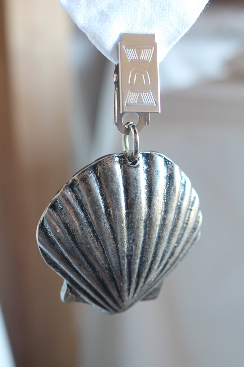 Add a touch of whimsical fun to your outdoor table this spring and summer with nautically themed tablecloth weights. Simple antique nickel seashells are suspended from a sturdy clip and their dangling charm is sure to provide that extra something to the table setting.