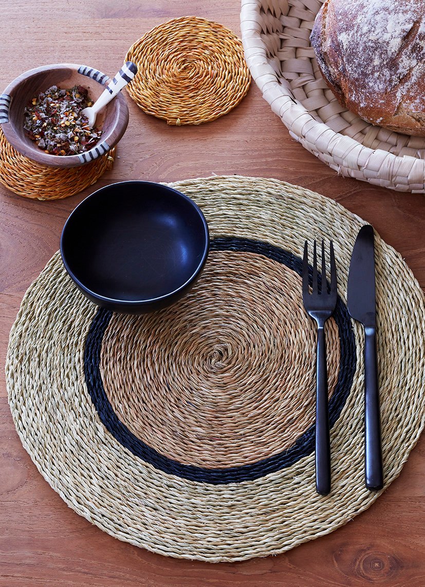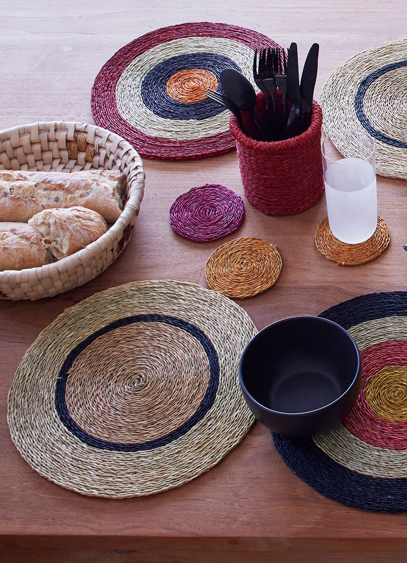 A set of two tightly woven grass placemats is a firm favourite among Africans. They are handmade by Sawzi women picking the grass by the rocks of the mountains dying, making ropes from it. Contrasting blue, natural and red grasses are superbly woven together to create a circular pattern.