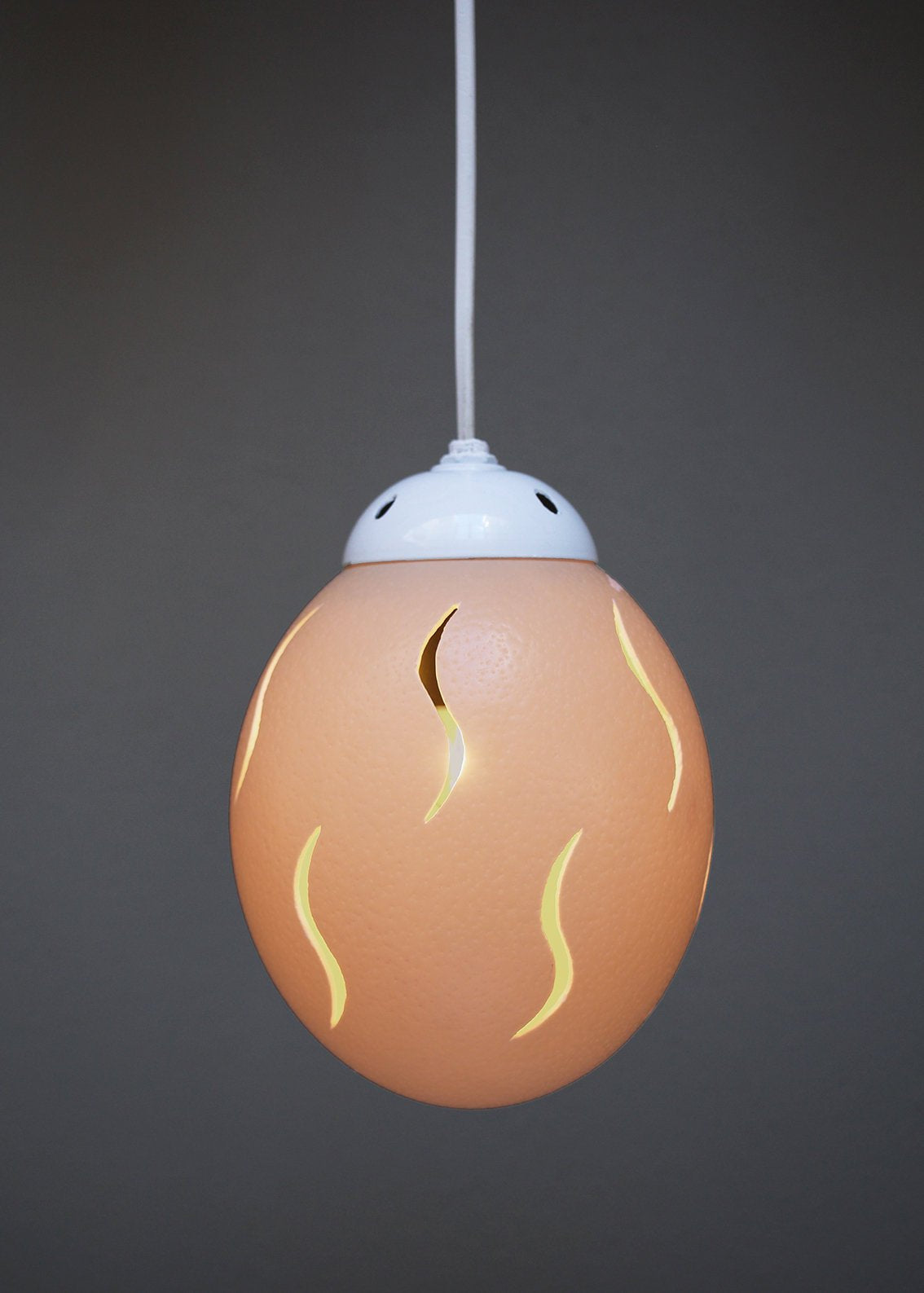 For those who prefer simple, yet powerful, statements this etched ostrich eggshell pendant would suit. Carefully carved to allow the warm glow of the light to spill out, the overall effect is simple, modern and elegant. Each ostrich eggshell is securely attached to a black cord with base – choose from matt black or white (at an additional cost). These pendants would suit elegant spaces, such as bedrooms, studies or even bathrooms.