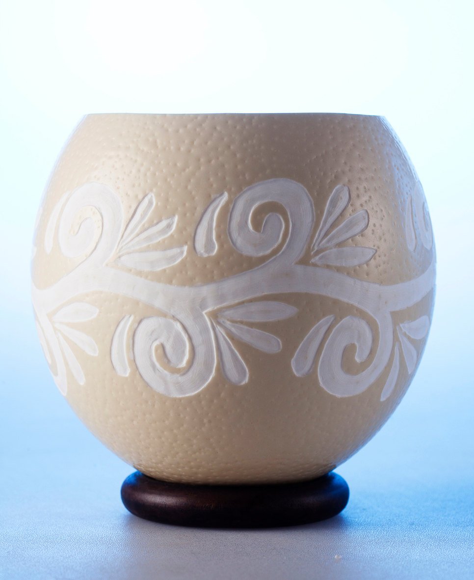 The elegant simplicity of this ostrich eggshell bowl will complement any space in the home from the bathroom to bedroom to kitchen counter; it can also be used as a tealight candle holder. The natural texture of the eggshell is offset by the simple engraved pattern encircling the bowl. The bowl is finished with a straight edge cut providing a harmonious balance with the circular base on which it is placed. This makes for a fantastic gift for those who love stylish accessories.