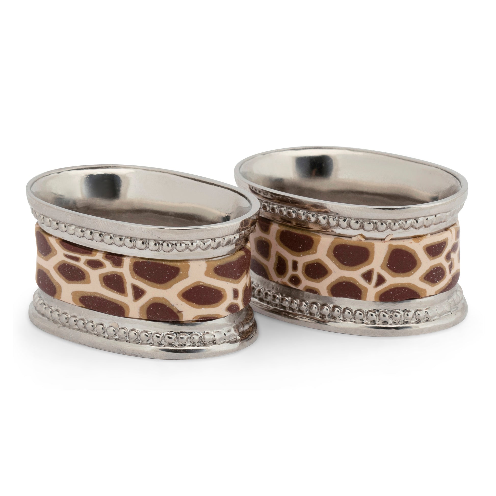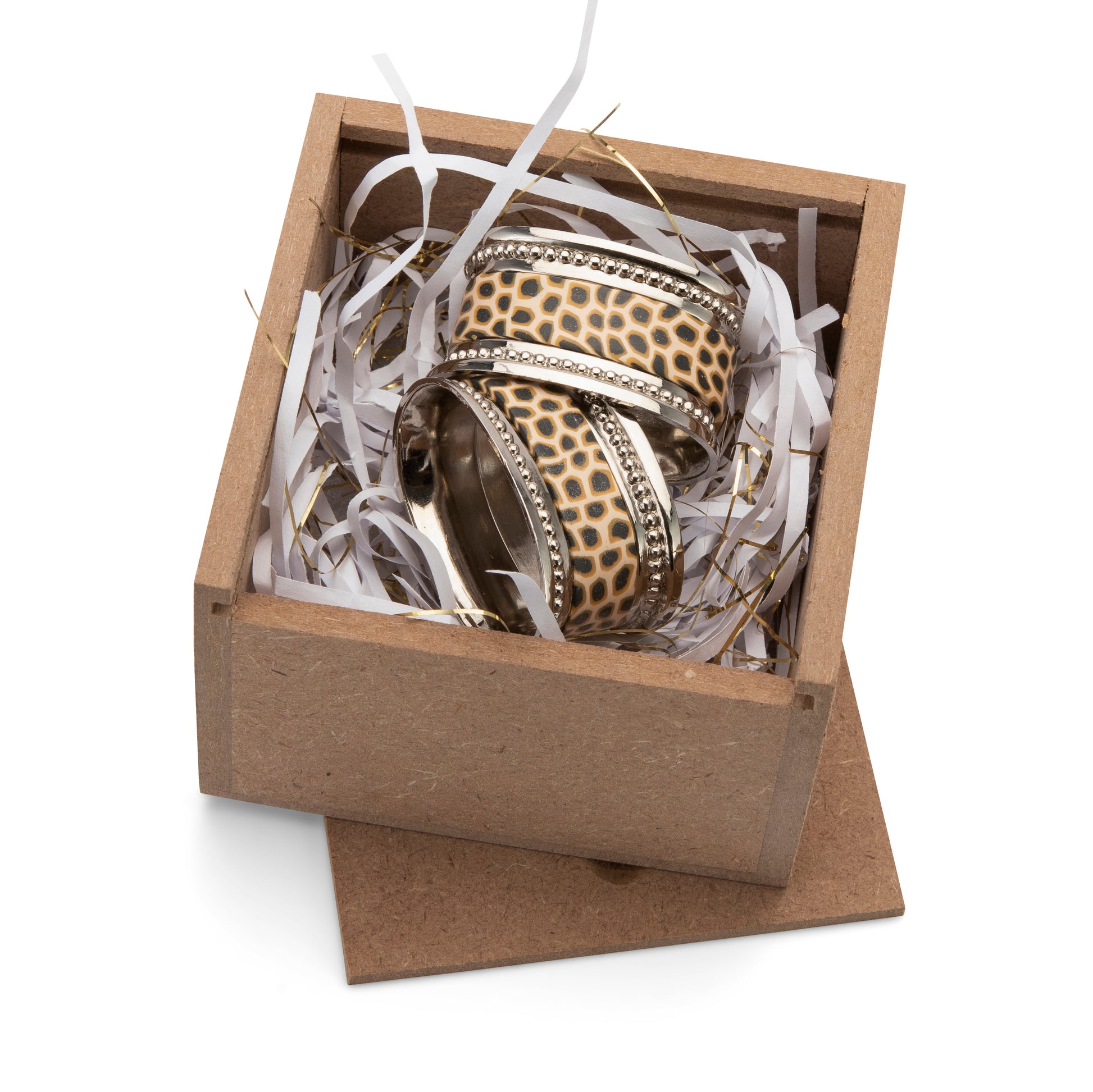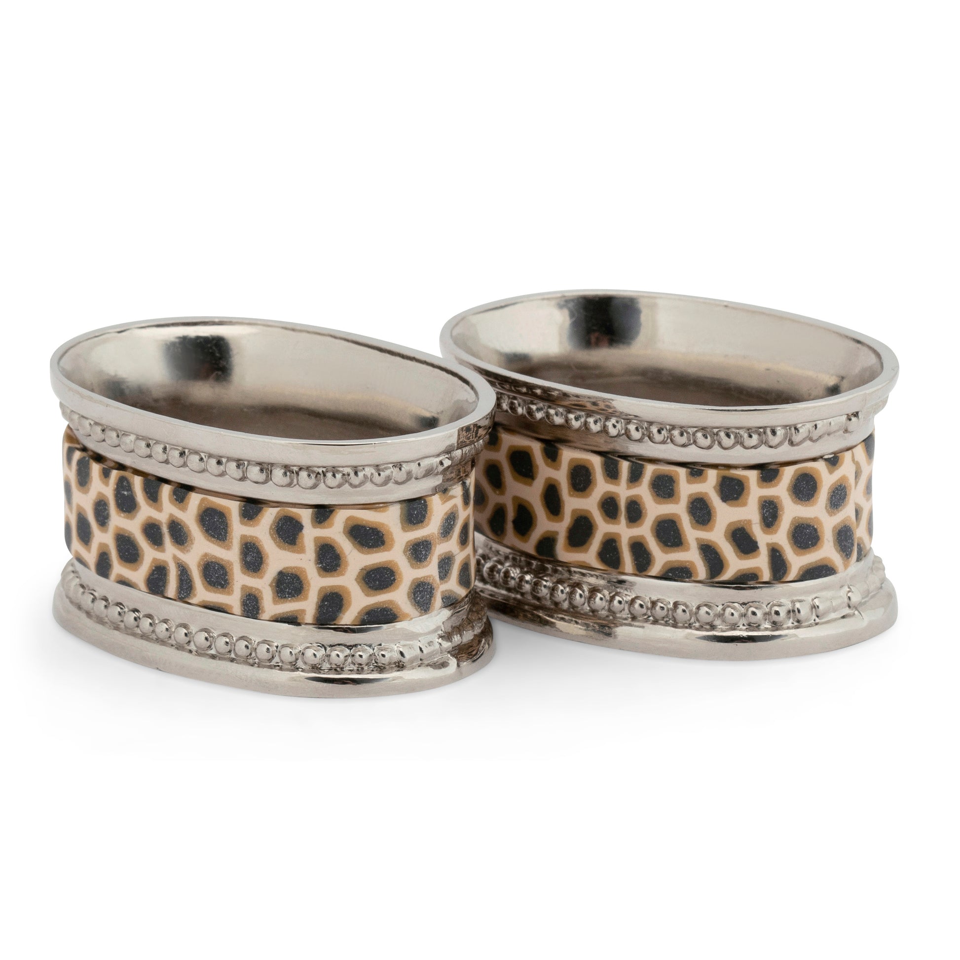 Napkin ring set: Decorate your table with these spectacular serviette rings, embellished with a fimo clay animal print. Made by rendered fimo and silver-plated, these aesthetic utensils provide a bold African style while also being long-lasting addition to your home. Receive your cheetah, guinea fowl, zebra or light giraffe set in style – beautifully packaged in a wooden gift box and cushioned with confetti.