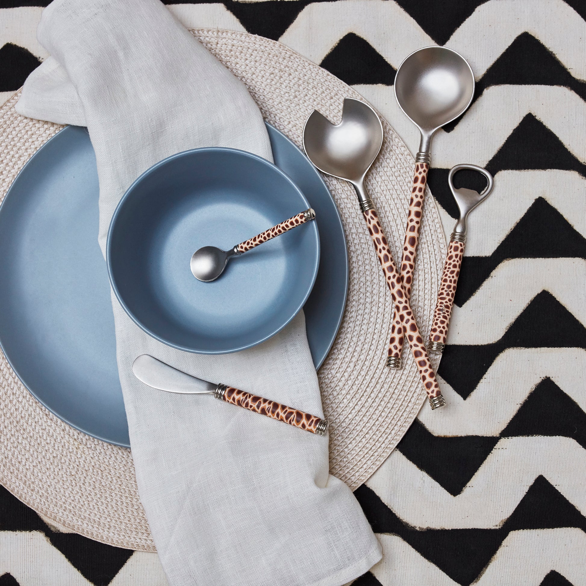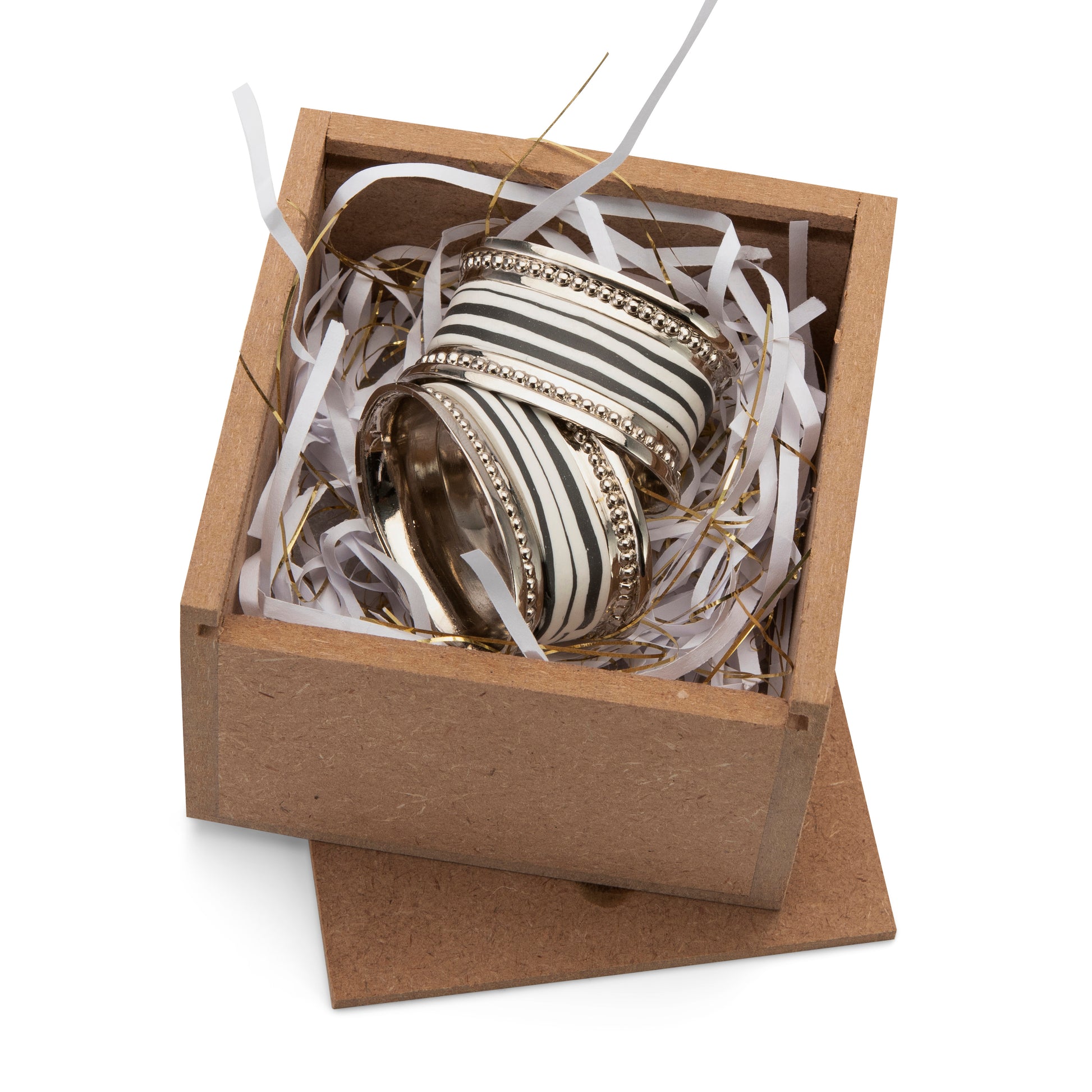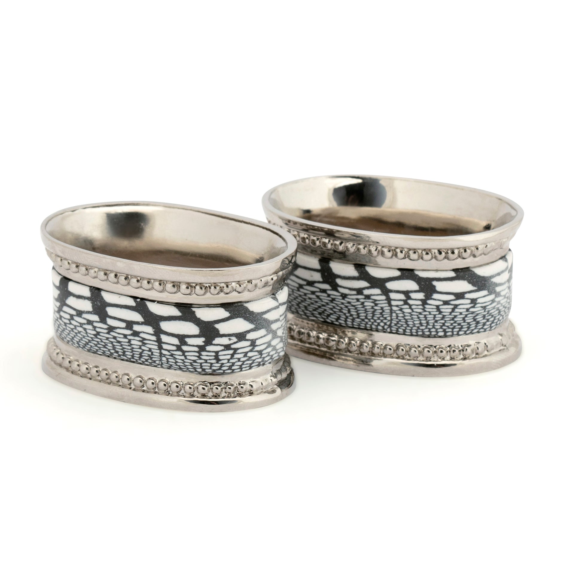 Napkin ring set: Decorate your table with these spectacular serviette rings, embellished with a fimo clay animal print. Made by rendered fimo and silver-plated, these aesthetic utensils provide a bold African style while also being long-lasting addition to your home. Receive your cheetah, guinea fowl, zebra or light giraffe set in style – beautifully packaged in a wooden gift box and cushioned with confetti.