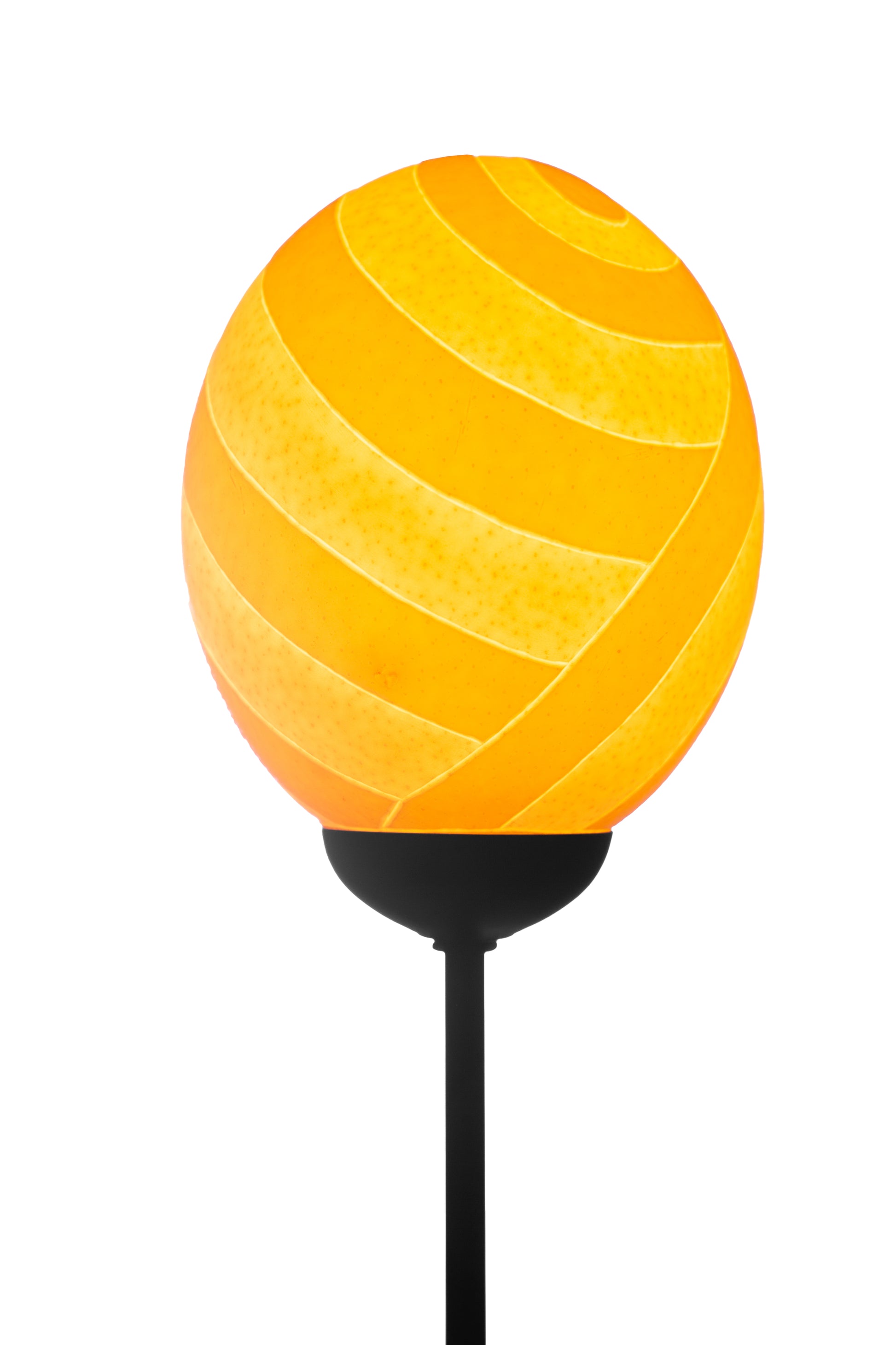 The perfect shape of a teardrop with its elongated heart shape is replicated through careful carving on this stunning ostrich eggshell lamp. The teardrop is duplicated in symmetrical lines that wind their way from back to front around the egg. The ostrich eggs are set on a simple metal stand to create a freestanding lamp that complements any style of decor. These lamps can also be made as pendants upon request.
