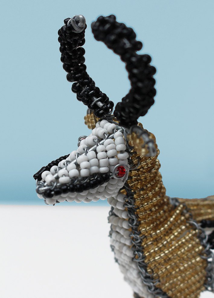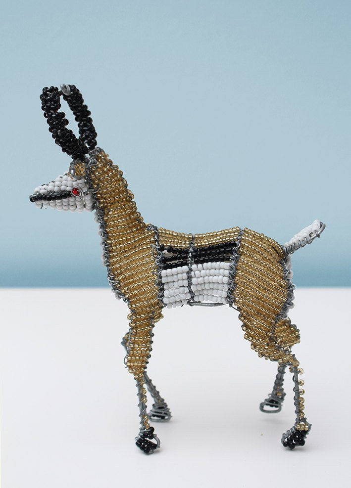 The elegance of one of South Africa's famed buck, the nimble springbok is captured eloquently on a wire frame filled out with white, black and gold beading. A great gift, stocking filler or memento of a trip to southern Africa. Approximately 17cm in height and 15cm long but can be custom-made to any size.