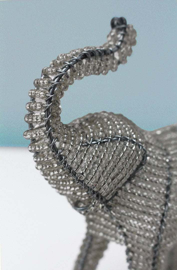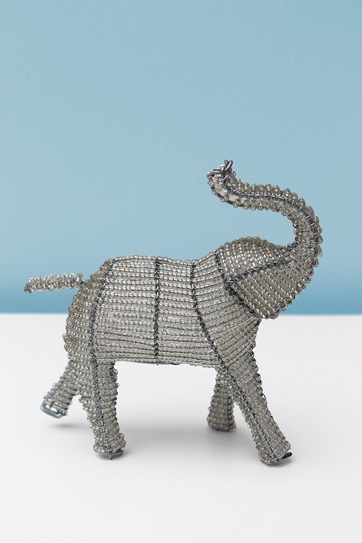 One of Africa's most loved animals, the elephant is beautifully captured in this simple frame and greyish white-beaded piece. Trunk up and making as if to stride off into the sunset, this piece will find a place in nearly everyone's heart. Approximately 15cm in length and 15cm high but can be custom-made to any size.