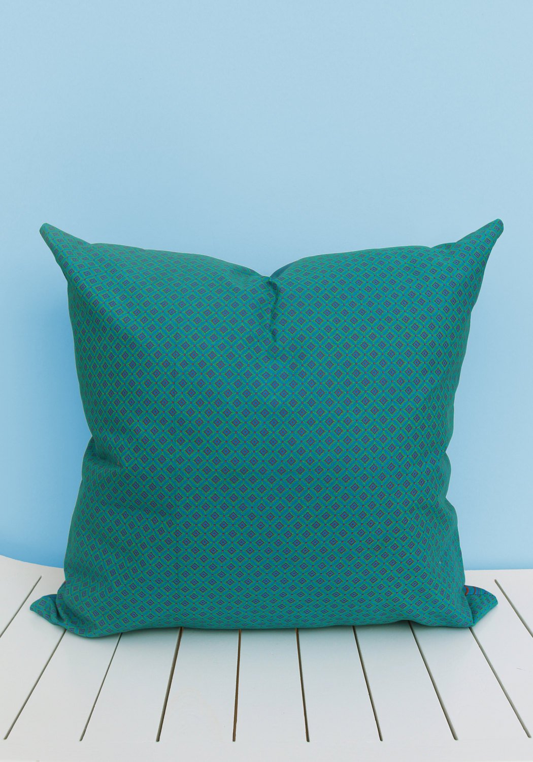 Turquoise with hints of pinkĀ and green Shweshwe scatter cushion 50 x 50cm: brighten up your home with this eyecatching mixed print African cushion. Shweshwe is printed dyed cotton, traditionally used for traditional South African clothing. A perfect gift and a striking piece to any entrance hall or lounge.