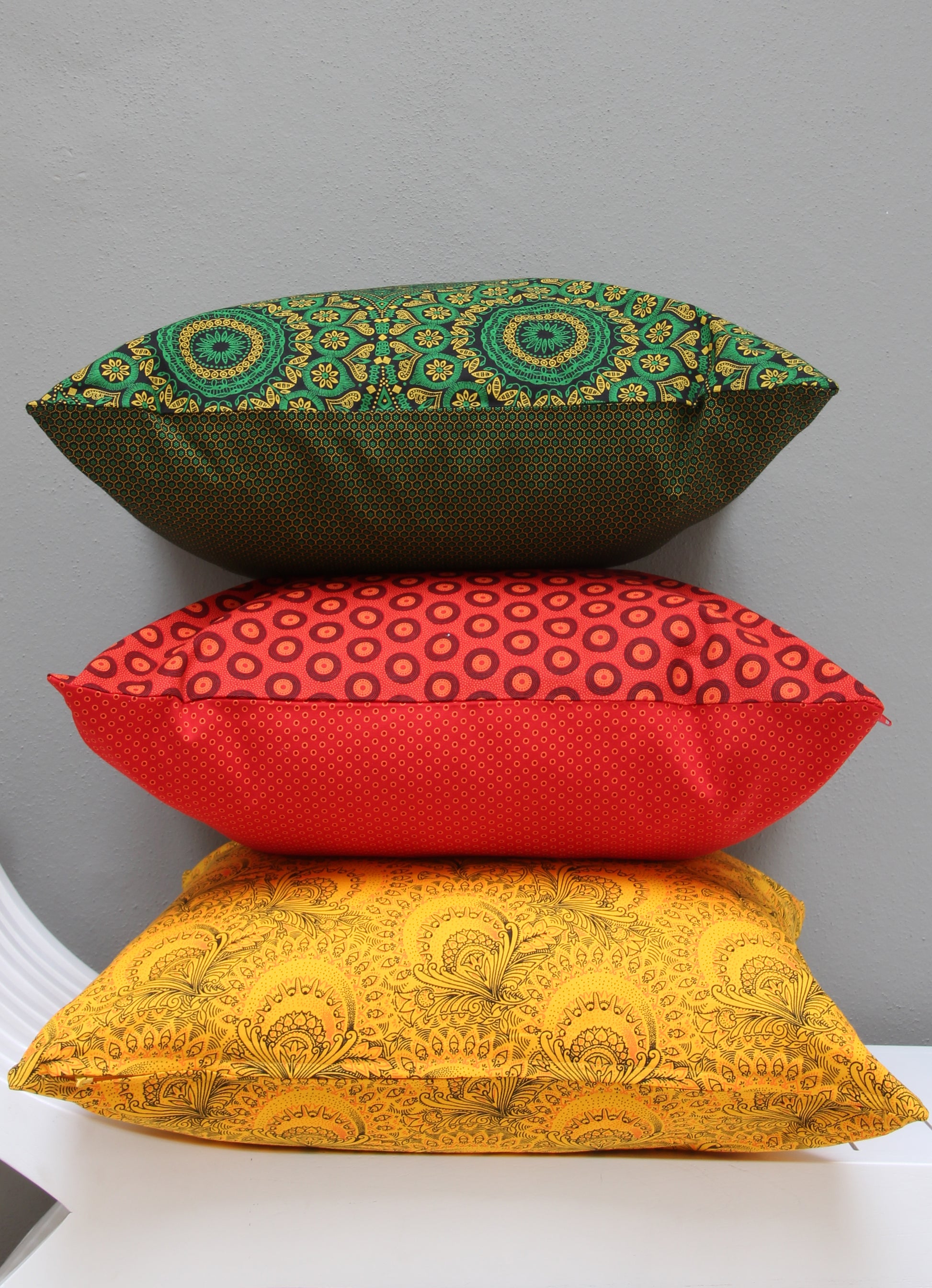 Vibrant red and black Shweshwe scatter cushion 50 x 50cm: brighten up your home with this eyecatching mixed print African cushion. Shweshwe is printed dyed cotton, traditionally used for traditional South African clothing. A perfect gift and a striking piece to any entrance hall or lounge.