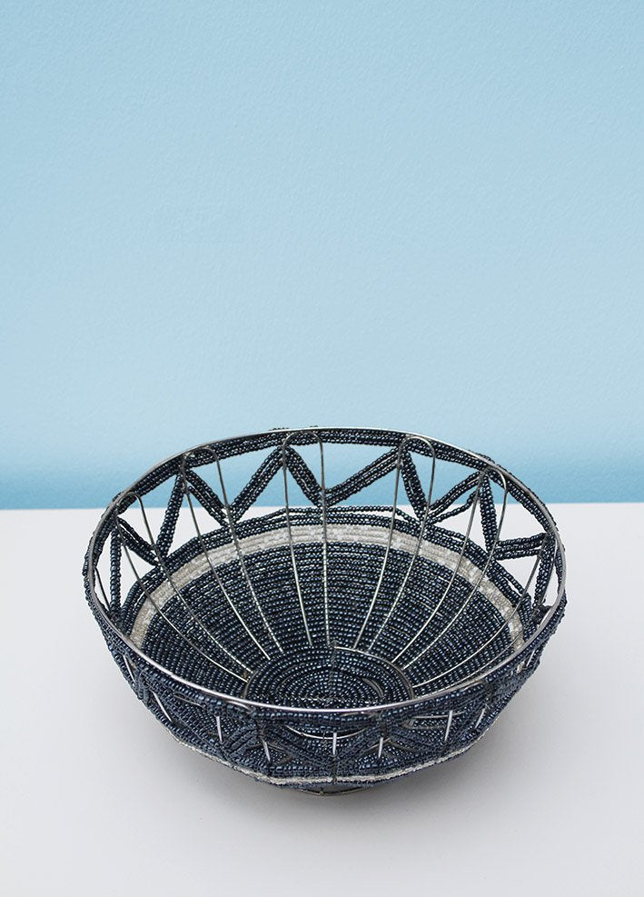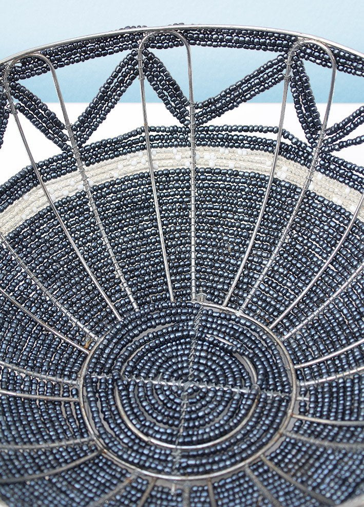 A functional piece that captures that African spirit with its simple wire frame and beautiful onyx and cream contrasting beading. The undulating pattern at the top is conveyed in wire and beading. A superb choice of bowl for keys or fruit or just as a decorative item
