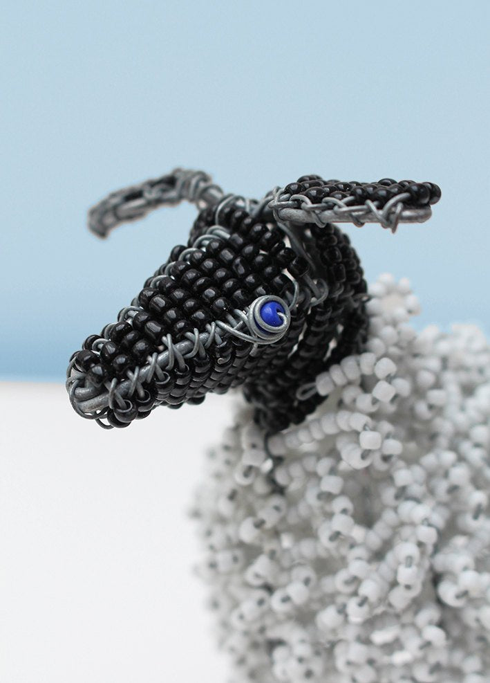The fluffiness of a sheep in pose is artfully illustrated in this fetching and very cute wire and beaded rendition, using both black and white beads. A great gift for children, and sheep lovers! Approximately 16cm in length and 13cm high but can be custom-made to any size.