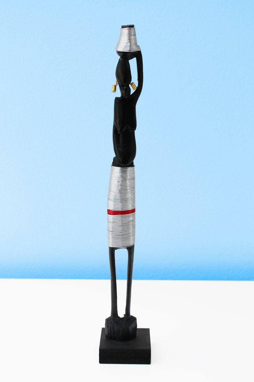 This is classic African with a modern twist. A woman balancing a jug on her head holds her belly. A sliver wire skirt with red relief encircles her slender body with the silver mirrored in the wire around the jug she holds on her head. Contrasting brass wire earrings provide a further depth and complexity to this simple African piece.