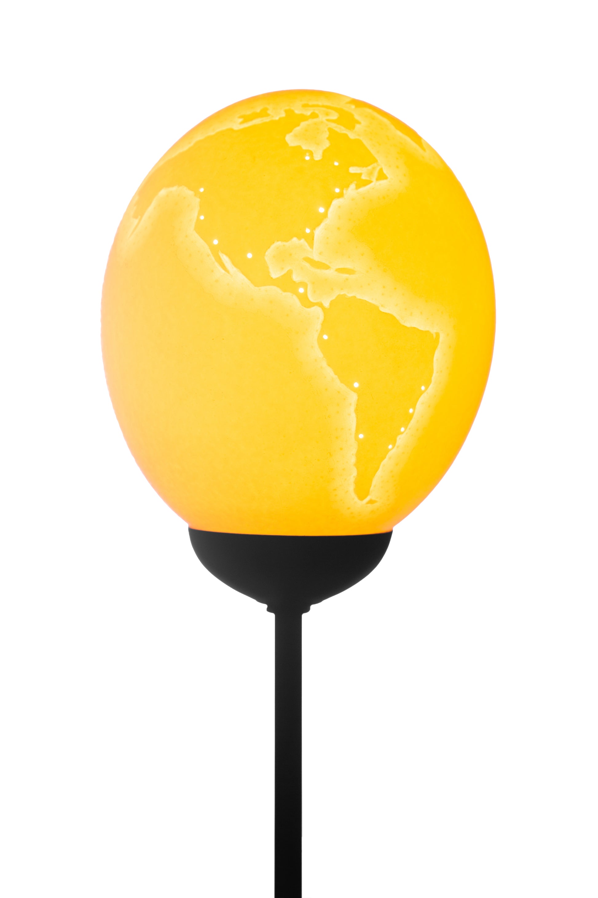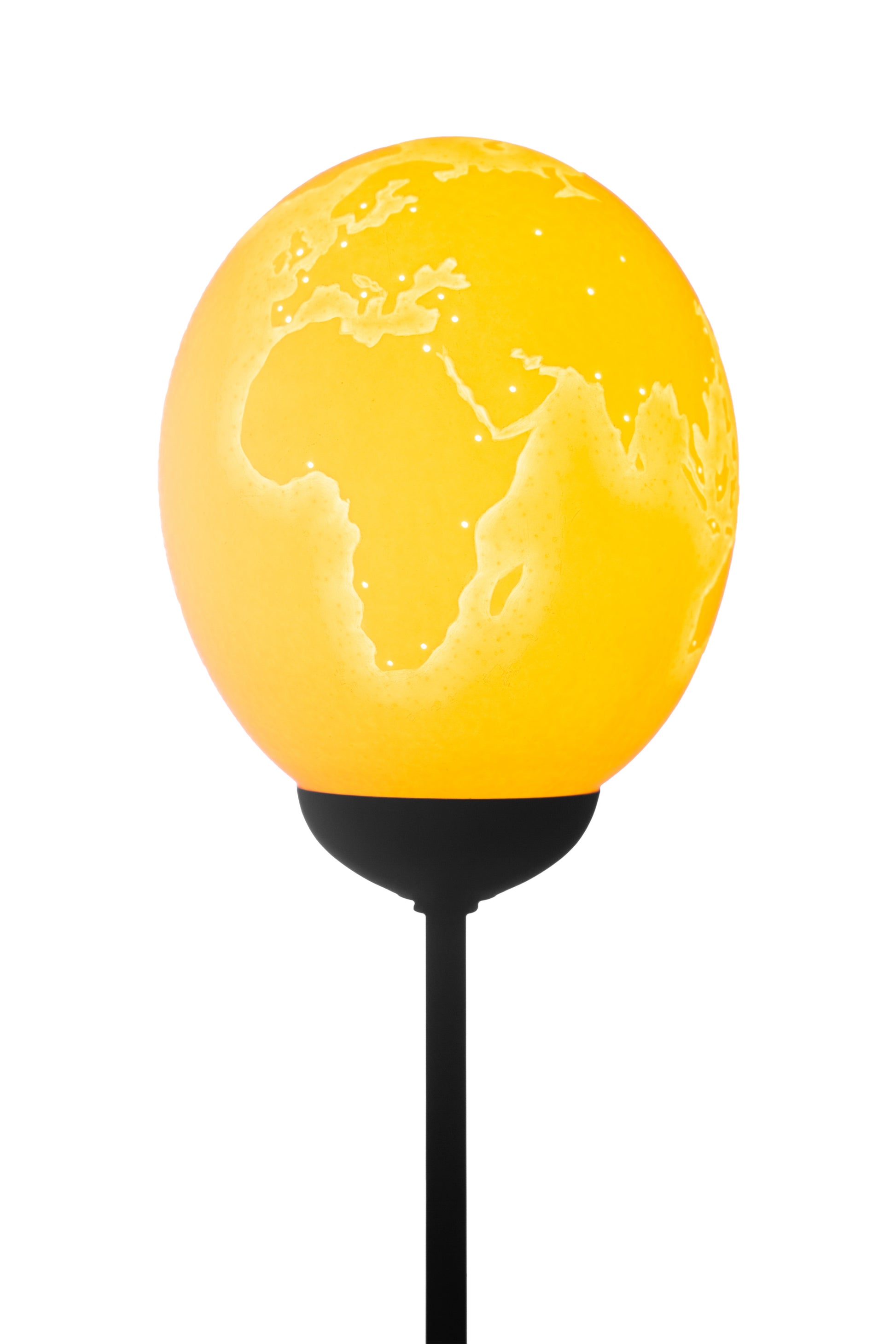 A carefully carved African ostrich eggshell sits atop a minimalist metal stand to provide a freestanding lamp that is unique and creative. With a map of continental outlines delicately carved into the precious shell, the lamp provides a universal touch to any space while echoing the mystery of Africa through the use of the ostrich egg. Certificates of authenticity supplied on request.