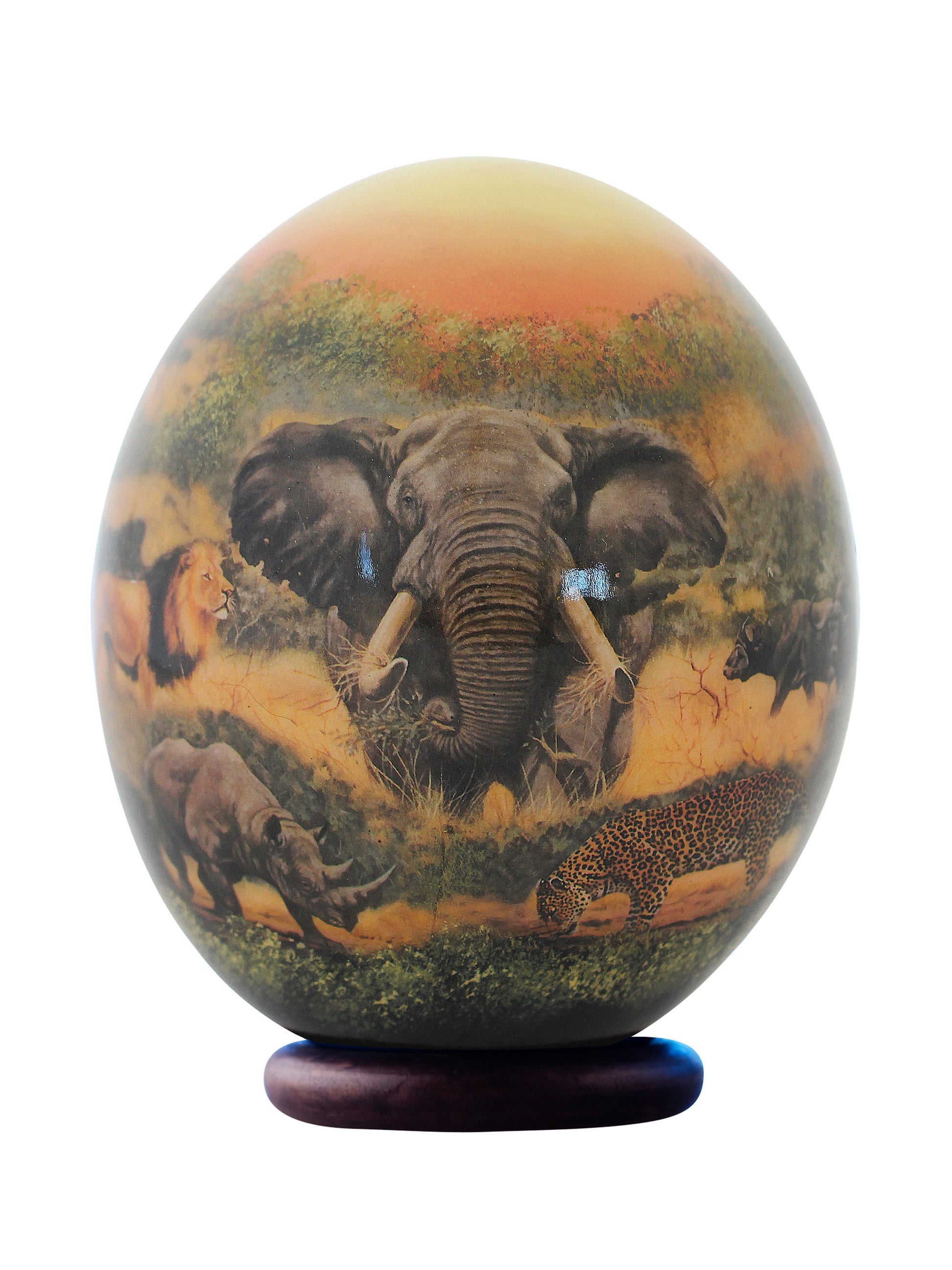 This beautifully decoupaged ostrich eggshell is a bespoke décor piece to have anywhere in the house – you might not be able to give it away as a gift. Africa’s Big 5 – the lion, elephant, rhino, buffalo and leopard – are colourfully and exquisitely depicted on the egg against a rich background of the African bushveld.