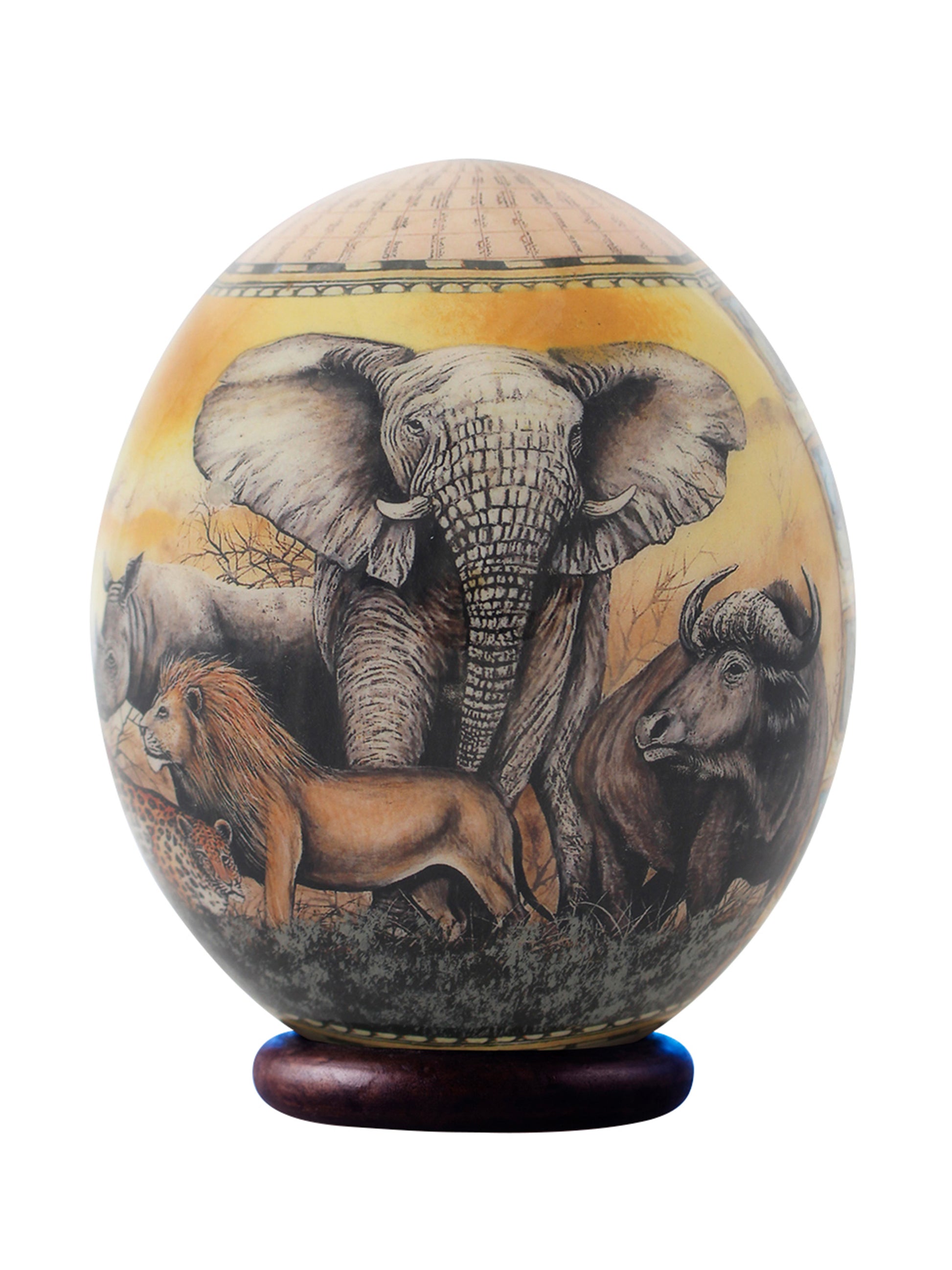 This beautifully decoupaged ostrich eggshell is a bespoke décor piece to have anywhere in the house – you might not be able to give it away as a gift. Africa’s Big 5 – the lion, elephant, rhino, buffalo and leopard – are colourfully and exquisitely depicted on the egg against a rich background and between abstract lines reminiscent of San artwork.